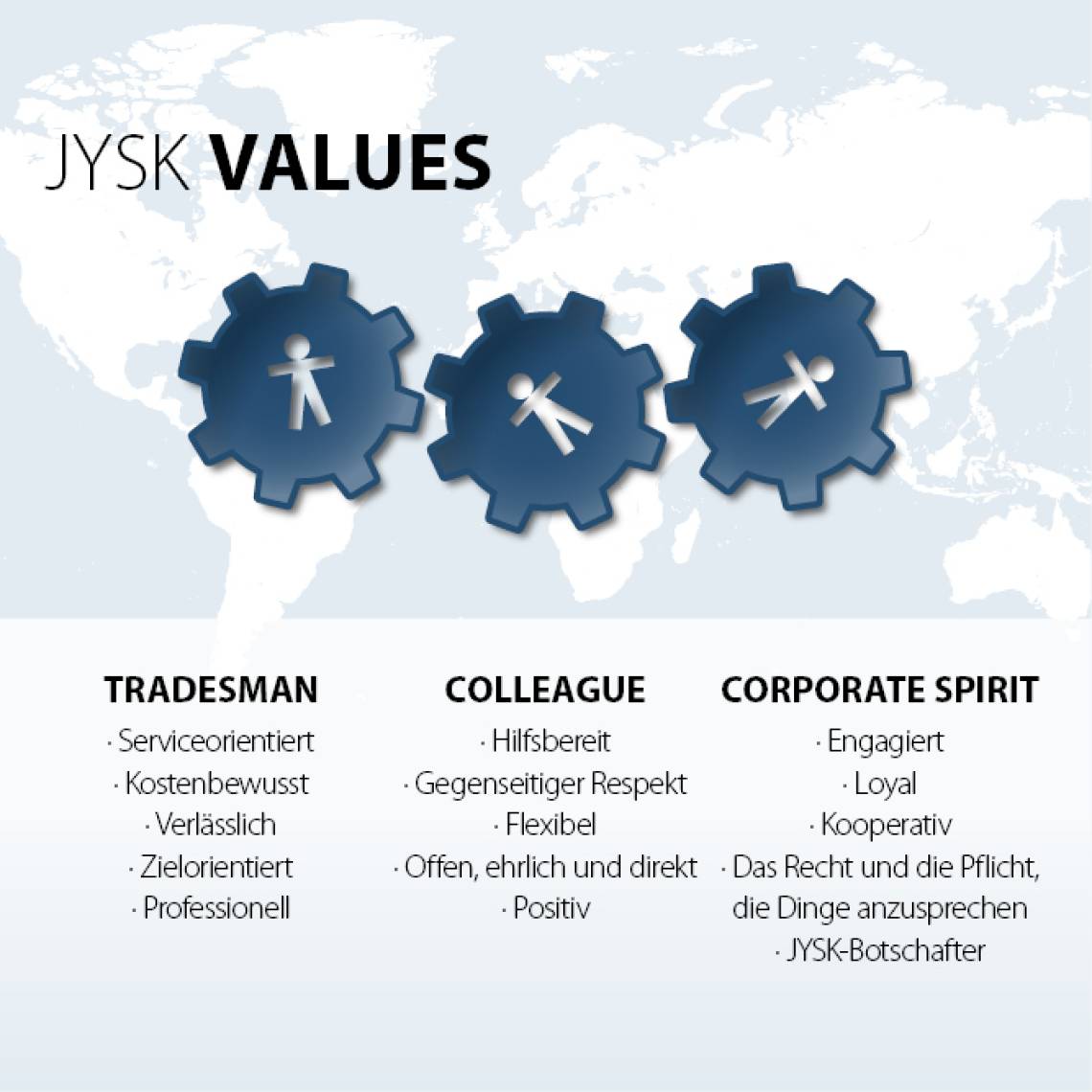 Unsere drei grundlegenden JYSK Values - #Kaufmann #Kollege #Unternehmergeist - stammen von unserem Gründer Lars Larsen. Sie stehen für das Verhalten und die Einstellung, die wir bei JYSK voneinander erwarten können.